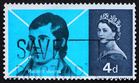 10802903 – great britain circa 1965: a stamp printed in the great britain shows robert burns and saltier cross of st. andrew, circa 1965